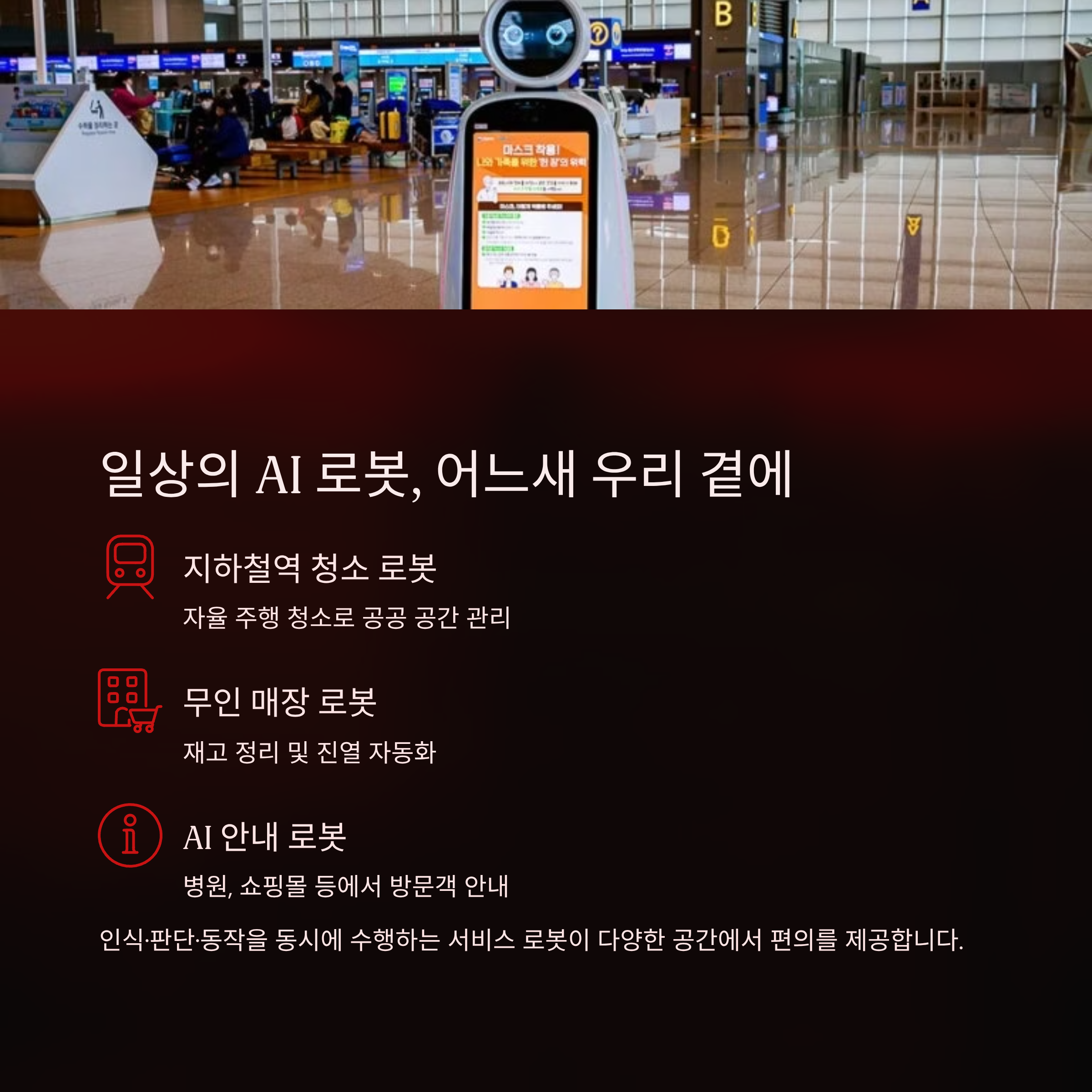 지하철역 청소 로봇, 무인 매장 내 정리 로봇, AI 안내로봇… 우리는 이미 다양한 형태의 지능형 로봇들과 공존하고 있습니다. 특히, 인식·판단·동작을 동시에 수행할 수 있는 서비스 로봇은 공공기관, 병원, 쇼핑몰 등 다양한 공간에 투입되어 편의를 제공합니다.
