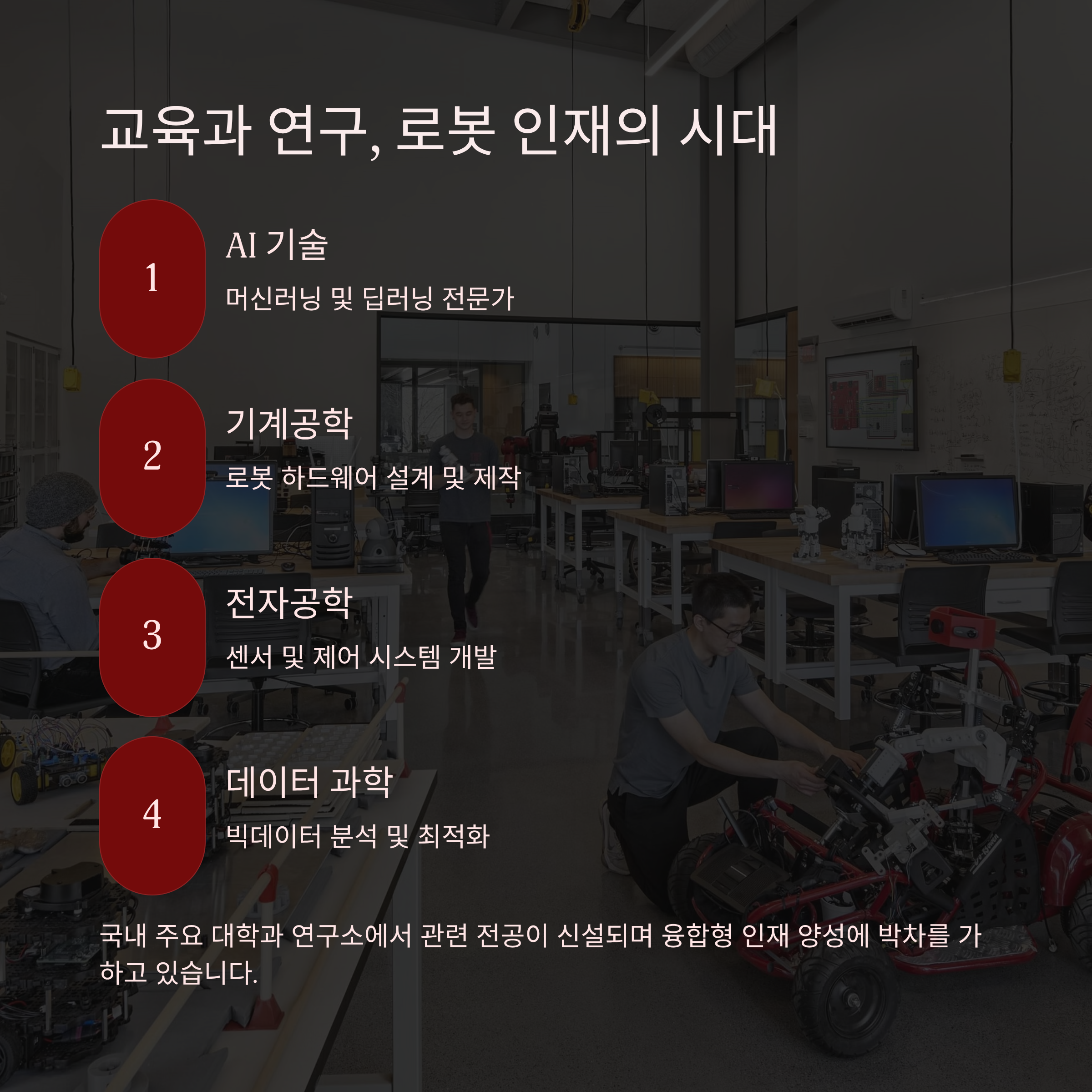지능형 로봇은 단순 기술 개발이 아닌 융합적 사고가 필요한 분야입니다. AI, 기계공학, 전자공학, 데이터 과학 등 다양한 학문이 접목되기 때문에 관련 인재 양성도 복합적으로 이뤄지고 있죠. 이미 국내 주요 대학과 연구소에서도 관련 전공이 신설되며 기술 개발에 박차를 가하고 있습니다.
