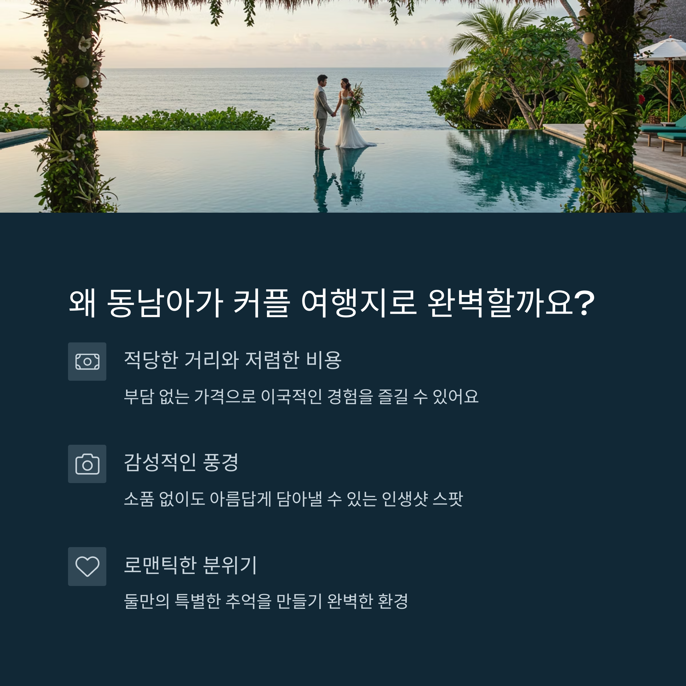 뜨거운 여름, 둘만의 특별한 추억을 남기고 싶다면 동남아는 최고의 선택지입니다. 적당한 거리, 저렴한 비용, 이국적인 분위기, 감성적인 풍경까지 모든 조건을 만족시키는 여행지들이 커플을 유혹합니다. 이 글에서는 사진이 예쁘게 나오는 인생샷 스팟과 함께 여행지의 매력을 다각도로 소개합니다. 소품 없이도 아름답게, 어떤 연출이든 자연스럽게 담아낼 수 있는 장소들만 엄선했습니다.
