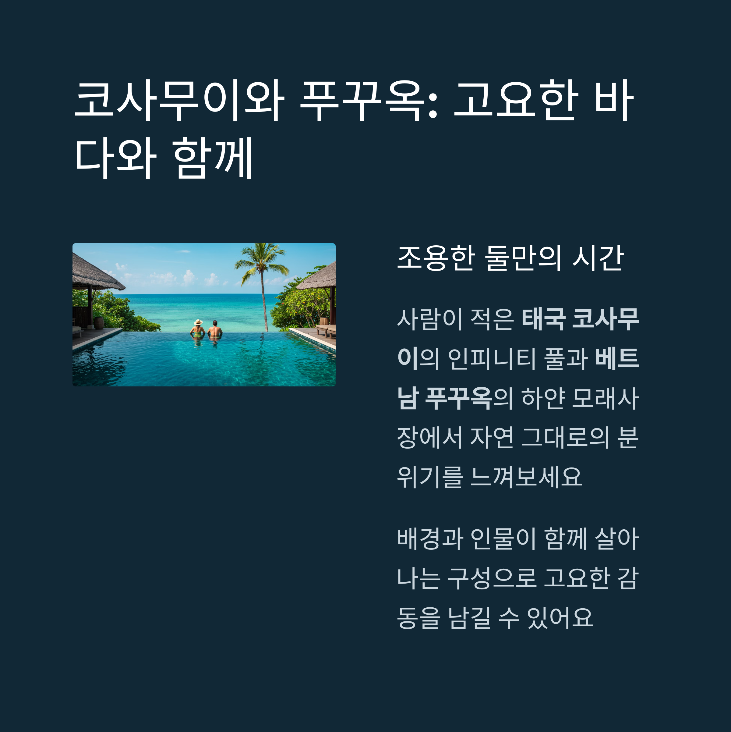 사람이 적고 조용한 여행지를 찾는다면 태국 코사무이와 베트남 푸꾸옥이 제격입니다. 코사무이는 인피니티 풀과 바다가 맞닿는 뷰가 압도적이며, 호텔에서 보내는 하루하루가 인생의 한 장면처럼 느껴집니다. 라마이 해변과 숨은 폭포 앞에서의 커플 사진은 고요한 감동을 남깁니다. 푸꾸옥은 아직 관광객이 많지 않아 더욱 자연 그대로의 분위기를 느낄 수 있는 보석 같은 섬입니다. 사오 비치의 하얀 모래사장, 유럽풍 테마파크 선월드, 바다 위 케이블카 등 ㅜ어느 각도에서 찍어도 배경과 인물이 함께 살아나는 구성이 가능합니다.