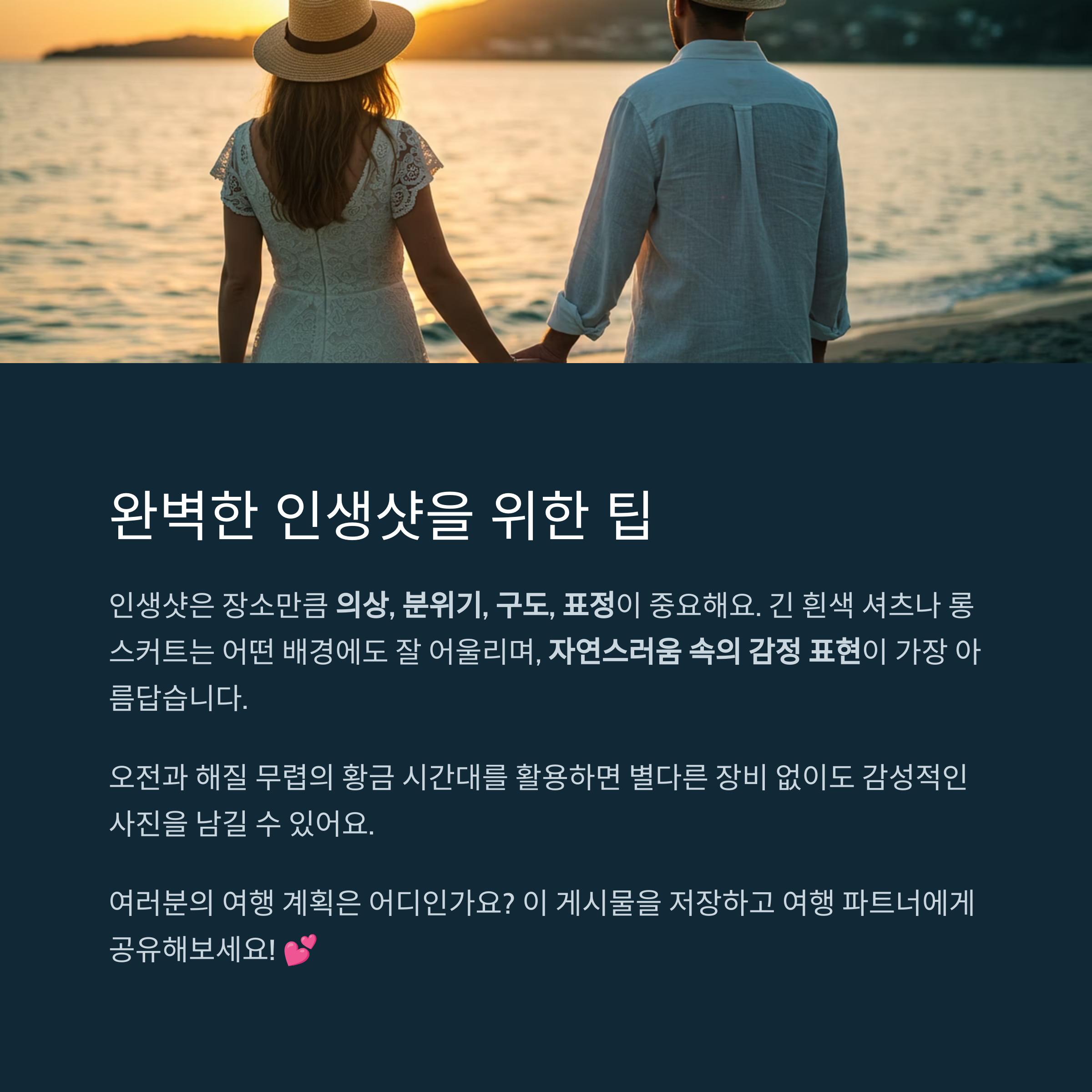 인생샷은 장소만큼이나 의상, 분위기, 구도, 표정이 중요합니다. 긴 흰색 셔츠나 롱스커트는 어떤 배경에도 잘 어울리며, 가벼운 스트로 햇이나 커플톤 소품은 분위기를 배가시켜줍니다. 중요한 건 자연스러움 속의 감정 표현입니다. 억지 포즈보다는 서로를 바라보며 웃는 장면, 걷는 뒷모습, 바라보는 시선 등이 오히려 더 감동적으로 남습니다. 빛이 좋은 오전과 해질 무렵의 황금 시간대를 잘 활용한다면 별다른 장비 없이도 감성적인 결과물을 얻을 수 있습니다.